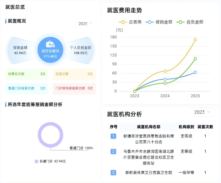 就医数据“深度读”,健康管理更主动:总览年度医疗总费用、医保报销金额及自付金额,就医行为全面复盘,让参保人清晰感受医保“保障”力度;概览住院、普通门诊、门诊慢病结算次数,通过就医费用走势,清晰展示医保结算历史;记录常去的医疗机构、就医地点(本地或异地)、就医备案情况,优化个人未来就医选择,真正实现“用数据帮着管健康”。